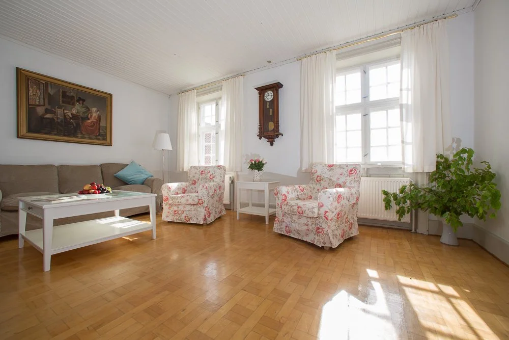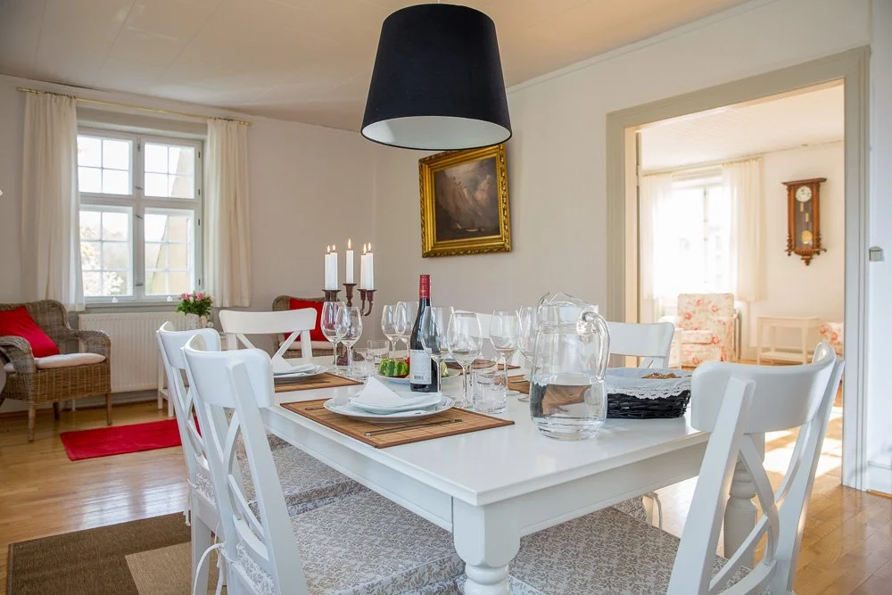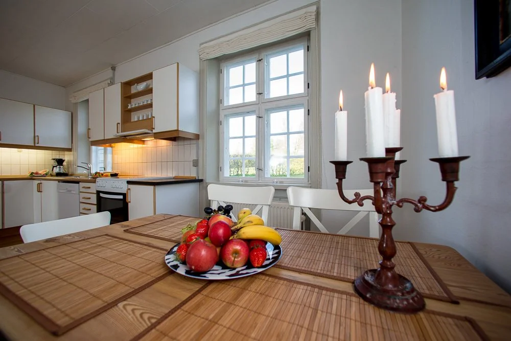 Bolig arealet er på 176 m2. Stuetagen består af indgang med trappe til 1 sal, 2 stuer (den ene med udgang til den sydøstlige terrasse), kontor og stort spisekøkken. Første sal er med 3 værelser, badeværelse m. brus samt gæstetoilet. Lejemålet er forsynet med fri varme fra Godsets Halmfyr. Månedlig leje udgør kr. 10.500,-Depositum 4 mdr. leje